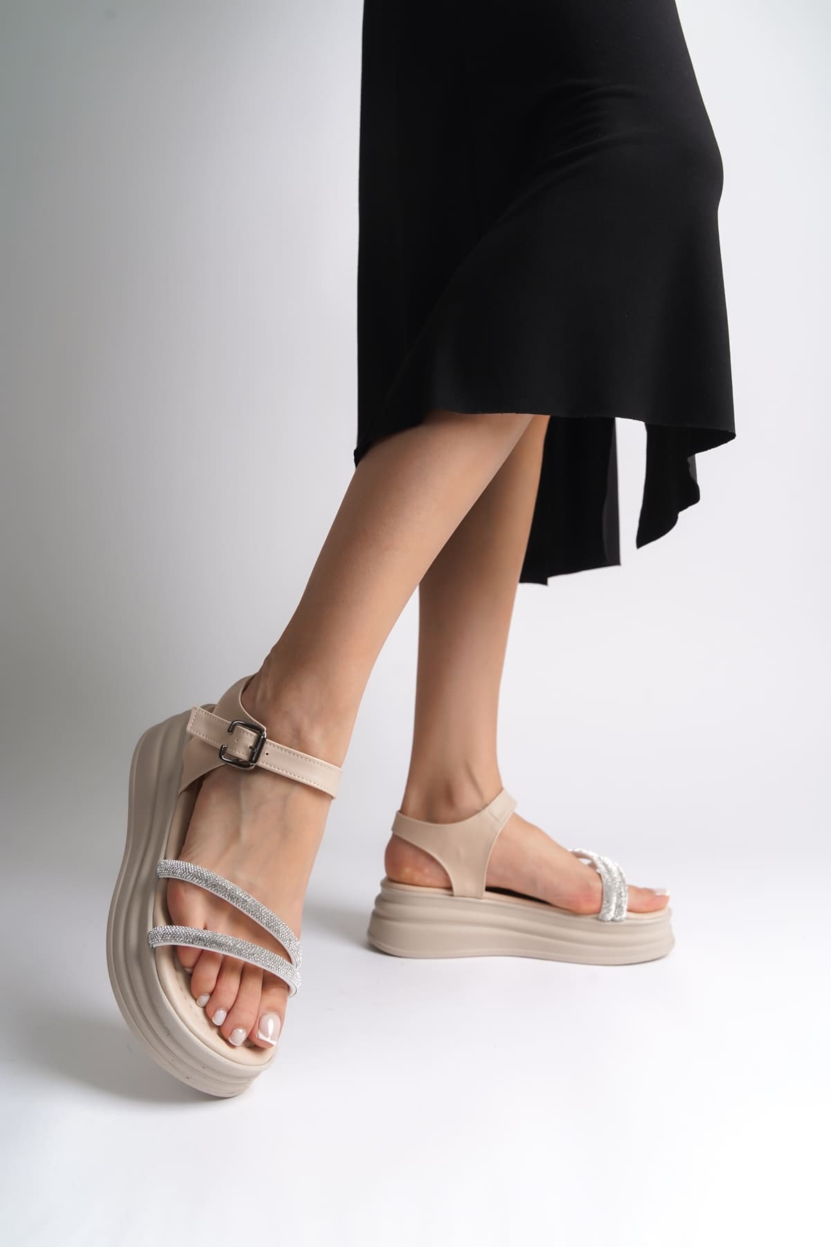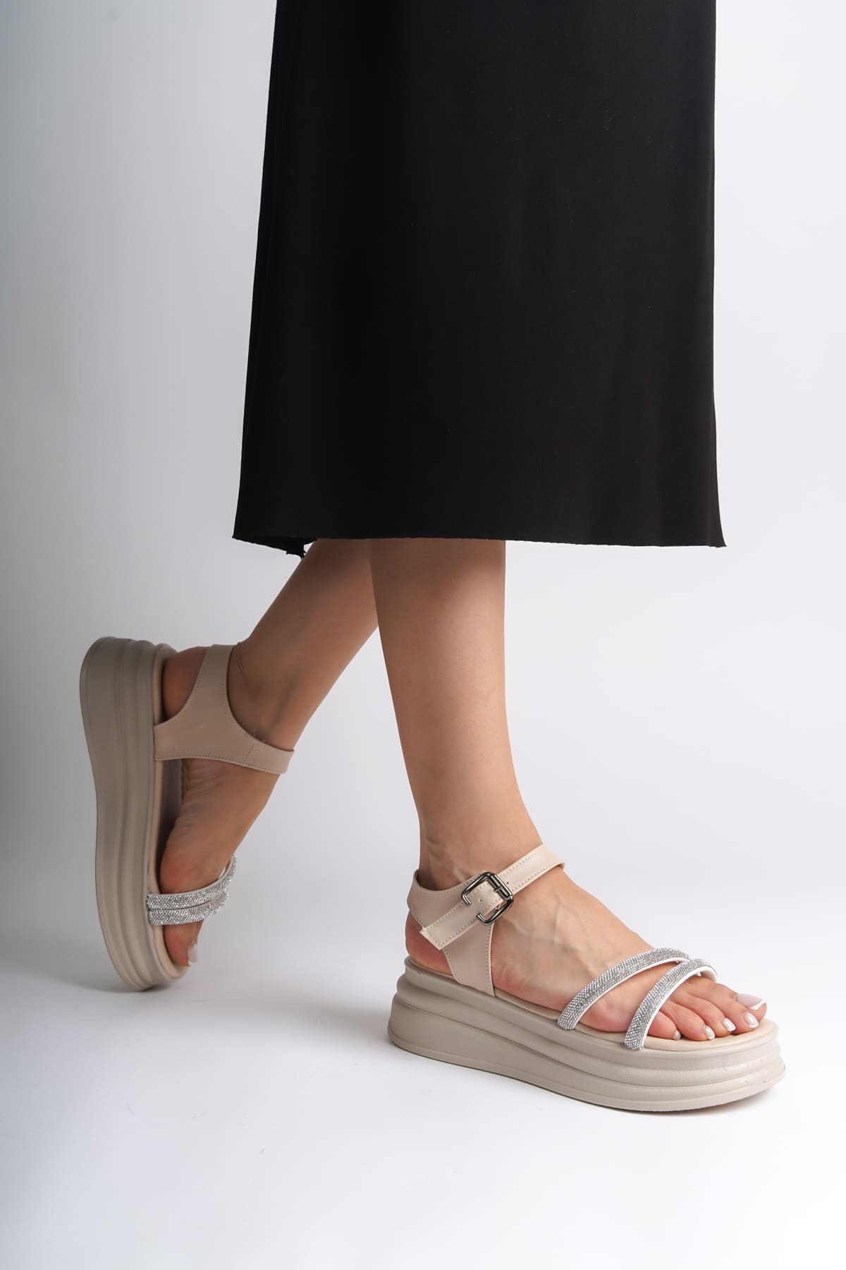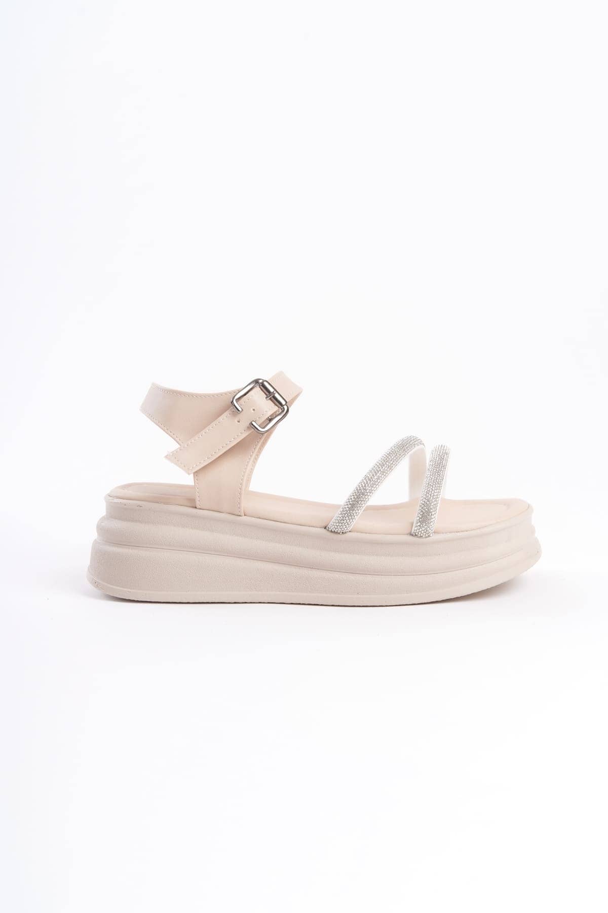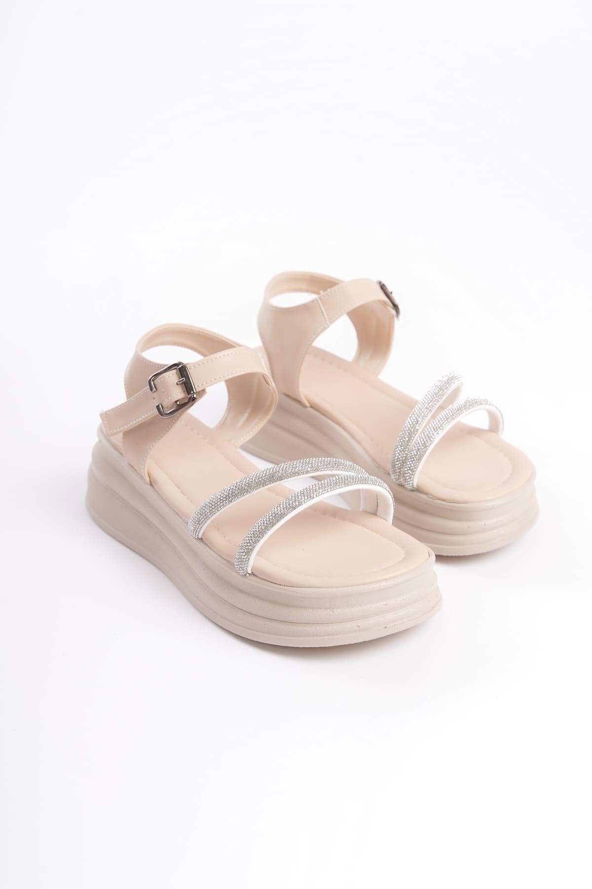 ZLOHE Kalın Tokalı Taşlı Şeritli Ortopedik Taban Kadın Sandalet CKT – Krem