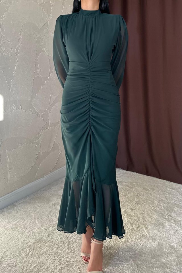 Zümrüt Önü Büzgülü Şifon Elbise