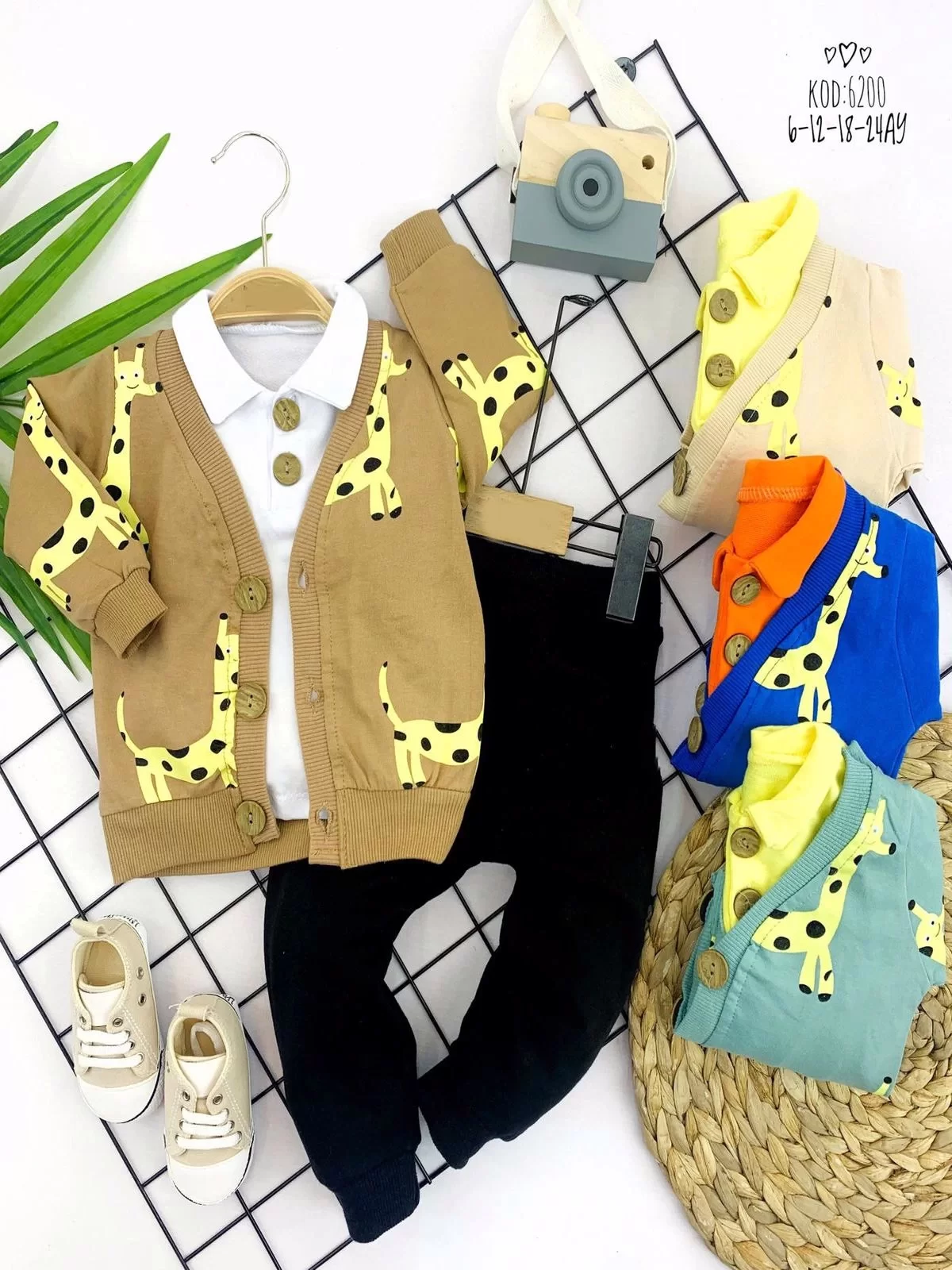 Zürafa Baskılı Yelek Uzun Kollu Sweat Pantolon 3 Lü Erkek Bebek Takımı Bej adet